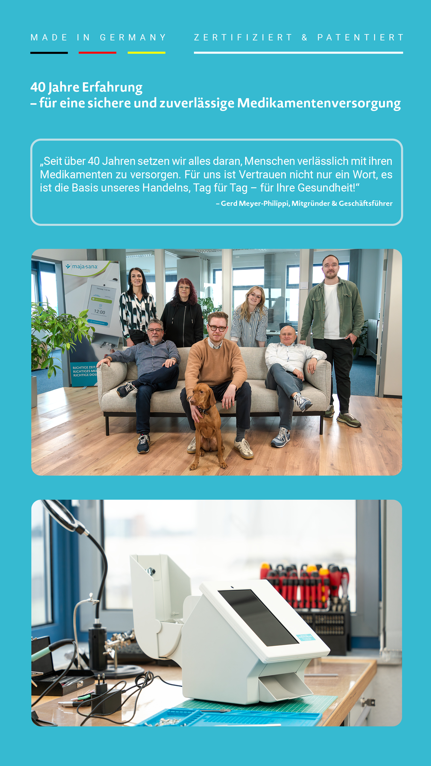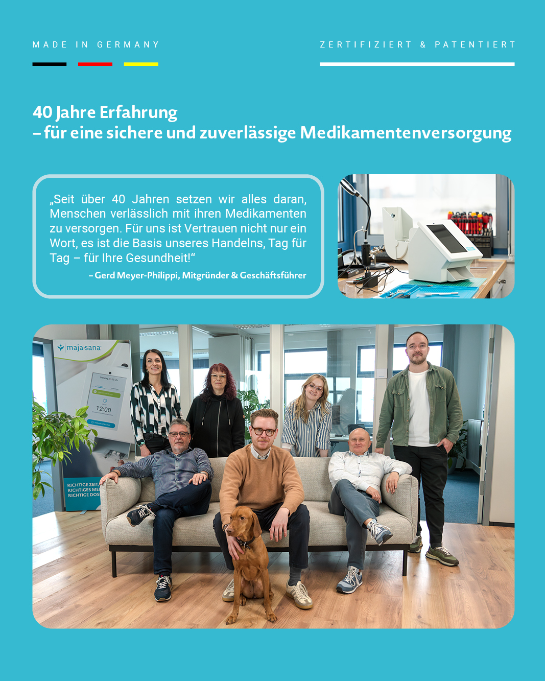 maja sana® ist unsere Lösung für sichere und lückenlose Medikamentenversorgung. Unser intelligenter Tablettenspender erinnert zuverlässig an die Einnahme und gibt genau zum richtigen Zeitpunkt die richtigen Tabletten aus. Auch das Vorsortieren der Tabletten entfällt. Werden die Medikamente nicht entnommen, sendet das Gerät eine Erinnerung. Auch pflegende Angehörige oder der zuständige Pflegedienst können bei Vergessen der Einnahme direkt benachrichtigt werden.