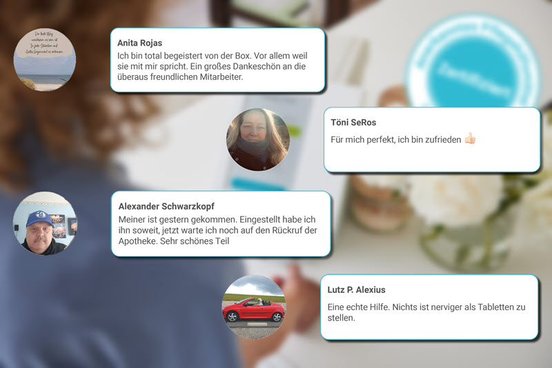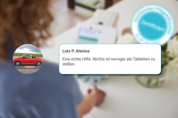 Ihr automatischer Tablettenspender wird bei Ihnen zu Hause nur noch mit der Medikationsrolle Ihrer Apotheke befüllt. Ab dem Zeitpunkt gibt der Spender zur richtigen Zeit die richtige Medikation aus und erinnert zuverlässig an die Einnahme. Bei Vergessen kann zusätzlich eine Kontaktperson benachrichtigt werden.